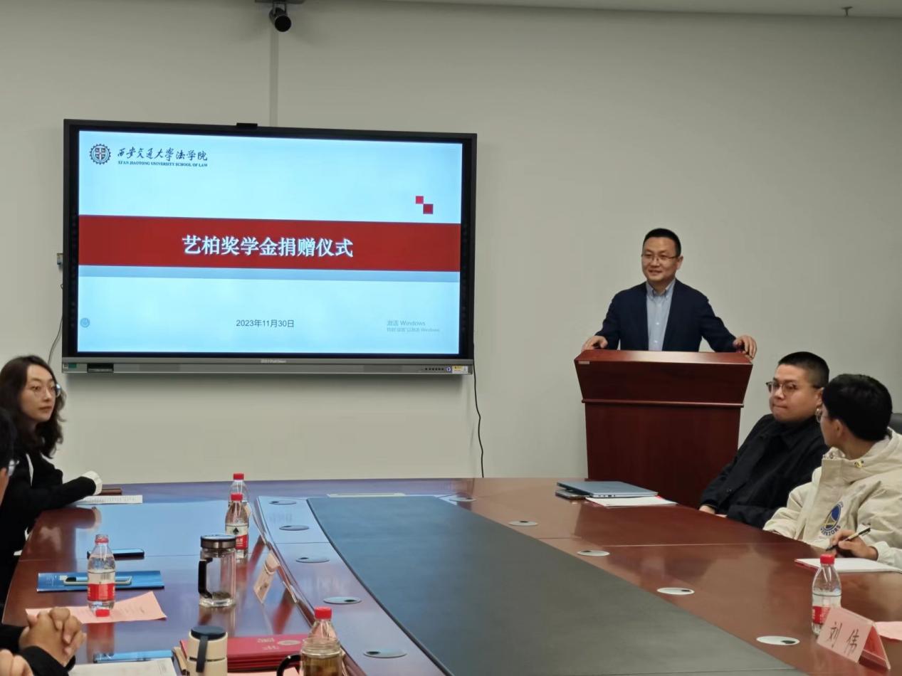 近日,开云(中国)官方在线登录艺柏奖学金捐赠仪式在创新港涵英楼5-3079会议室隆重举行。开云(中国)官方在线登录党总支书记王保民教授,教师代表刘志仁教授、杜军强副教授、寿媛君副教授,泰和泰律师事务所刘伟、侯童钰律师以及开云(中国)官方在线登录学生代表参加了本次仪式。仪式由唐学亮副教授主持。