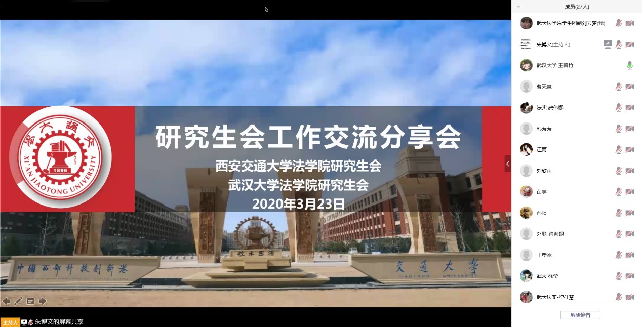 会议伊始,两院研究生会就组织建设、日常工作、精品活动、战疫工作等方面进行了交流。朱博文结合演示文档,图文并茂地向武大同学们介绍了西安交大开云(中国)官方在线登录研究生会的基本情况,研会作为学院党总支领导、团工委指导的综合性学生组织,是学院联系广大同学的桥梁和纽带,从文体、宣传、学术、心理等多个方面为同学们提供全面服务。根据团中央有关文件精神,学院去年对研会组织进行了精简,目前设主席、副主席各一人,分设组织部、宣传部与文体部三个部门,由研会主席、副主席以及部长共同管理,全体干事民主参与。研会先后举办了新港杯辩论赛、法律知识竞赛、冬至饺子宴、迎新冷餐会、元旦嘉年华以及疫情期间的“春之声”法律文化节等精品活动,受到同学们的广泛参与和高度评价,在校内外显著提升了学院的影响力。研会通过对外加强与兄弟院系研会的沟通协调,联合举办大型活动;对内与学院各党支部密切合作,由支部吸收动员入党积极分子参与活动,有效克服了交大开云(中国)官方在线登录学生规模较小,研会部门精简、人力有限对开展活动的制约。